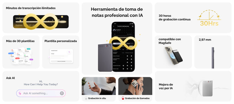 Capta cada detalle con facilidad. PLAUD NOTE rompe el récord al ser el primer dispositivo de grabación en integrar un motor de reconocimiento doble.